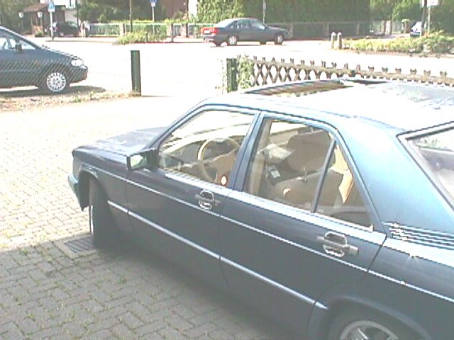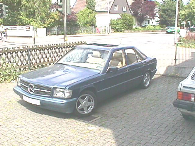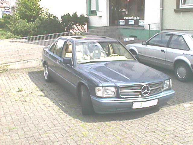 Das ist ein ursprünglich 83er Modell. Erstzulassung war seinerzeit auf das Autohaus Mercedes in Berlin, ich denk also mal, dass das ein Vorführwagen gewesen ist. Dann wurde das Teil 92 komplett neu aufgebaut, dh lediglich der Rahmen ist wohl geblieben. alles andere drumrum wurde vom 92er Modell neu übernommen, also Motor, Getriebe, ABS Zeugs, alle Innereien und so. Nun hat er fast alles, was man so haben kann: Klima, ESD, EFH, dieses komische cremefarbene Leder, getönte Scheiben, Grünkeil, Sportline, also tiefer und härter und so auf 195, SEC Haube, winziges Lenkrad, dazu hab ich von 4 auf 5 Gang umgerüstet wegen der Autobahnfahrerei, ne 350 Watt Magnat Anlage rein. Der Wagen hat grade mal 90.000 runter, kann eigentlich nicht klagen, nur das er halt als 1,8er ein wenig schwachbrüstig ist, aber man kann ja nicht alles haben :) |