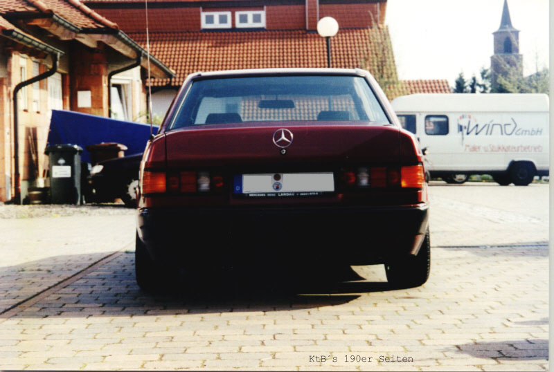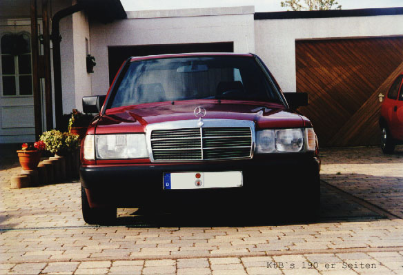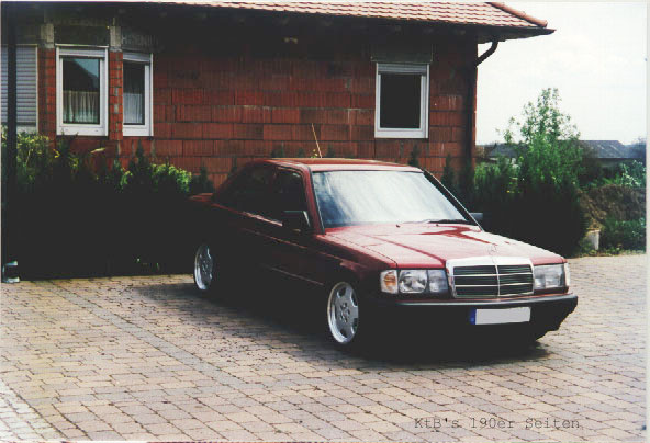 190E 1,8 Baujahr 1991 Kilometerstand: ca. 140000 km Farbe: aldamarinrotmetallic Serienausstattung (Drehzahlmesser nachgerüstet) 60 mm H&R Federn, Vorderachse 1er Gummis RH-Felgen 8 x 16 ET35 mit Pirelli P7000 215 / 40 weisse Blinker Lorinser Lederlenkrad 38er Clarion Radio mit 12fach Wechsler Front- und Hecklautsprecher Serie K&N Sportluftfilter