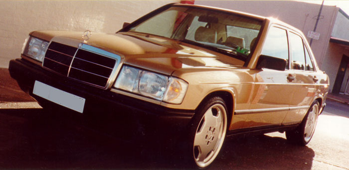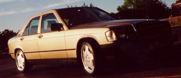 Scott´s 190er (Aus den USA) techn. Daten (Halterangaben): 1986 190E 2.3 mit 5gang schaltung 17x7.5 ET35 AMG style Felgen mit 215/40/17 Sumitomo HTR-Z II's hinten und 205/40/17 Dunlop SP Sport W10's vorne. H&R Tieferlegungsfedern mit Bilstein Sportdämpfern. Kenwood CD player und Infinity Boxen (Which Ansa sport Scahldämfer Bosch European headlights (Is ja ein US Auto) |