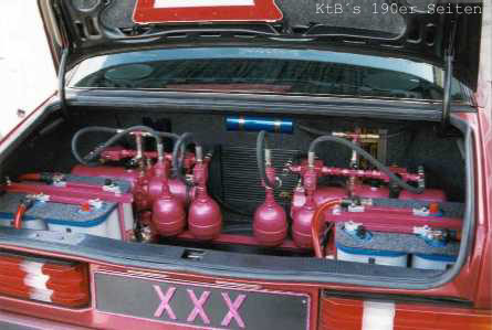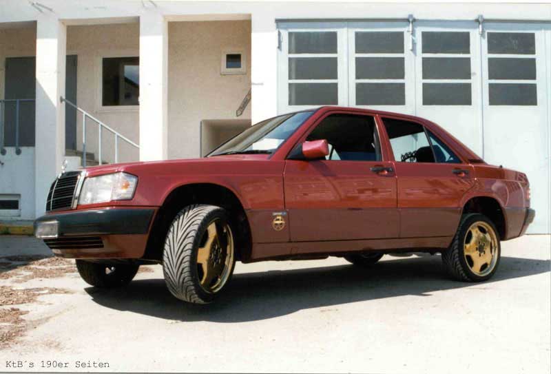 technische Daten (Halterangaben): 190E 2.0 Bj. 6/91 Almadinrot Metallic, Sportline, Autom., Klima Vergoldete 7,5"x17" Intra Felgen , 32 mm Holz Lenkrad mit vergoldeten Speichen, Kühlergrill Gitter ist gerade beim vergolden, "Ami" Blinker, HiFi im Kofferraum: ein ESX Monoblock, 2 AMA Endstufen, 15" Sub in Ersatzradwanne, 3 Wege Rainbows in Doorboards und 13er Altec Lansing in der Hutablage. Die Federn sind komplett ausgebaut und die Federung wird nun von Stickstoff Kugeln übernommen (wie bei Citroen). Stoßdämpfer wurden gegen angefertigte Hydraulik Stempel ersetzt. Der Kofferraum ist jetzt proppen voll. | |||||||||||||||||||||||||||||||||||||||||||||||||||||||||||||||||||||