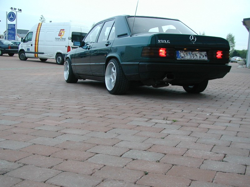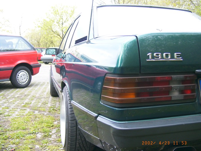 techn. Daten (Halterangaben): - 190 E 2.0 122PS - EZ 1985 - Fahrleistung = 285.000 km bei 240tkm wurde der Motor von Mercedes generalüberholt (läuft wie'n Neuer) - FK 70/40 Fahrwerk - 9*16" ET 26 Shaper Champ mit 215/40 Yokohama A 539 rundum - hinten gebördelt - Weiße Blinker, leicht verdunkelte Rückleuchten - Original Grill modernisiert - *Böser Blick* von Mattig - Ovales Anschweissrohr (nur zur Obtik) - Offener Sportluftfilter von Raid HP (Tröte) - Scheibenwischer auf Mittelstellung umgebaut - wurde neu lackiert (natürlich ne Mercedes Benz Farbe!) war vorher Bundeswehr grün. - FK - Funkfernverbindung für die Zentralverriegelung - Spannungslupe in der Mittelkonsole durch 8 LED'S (Eigenbau) - 32er Raid HP (im Alu look) + Alu Schaltknauf Beleuchtet!! (Blau) - blaue Tachobeleuchtung - drittes Bremslicht mit 50 LED's