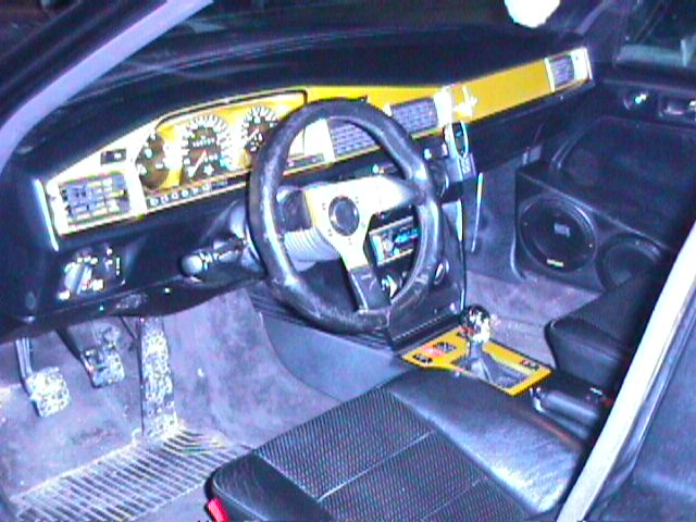 techn. Daten (Halterangaben) 2,5 16V,Bj. 07/91,Vollausstatung bis auf Klima :-( 9+10X16 Steffan BCW mit 215+225, 40er Weitec Federn M3 Spiegel, Remus mit angebratenen 80er DTM Rohren, Golf Lippe und SEC Haube Vorne Doorboards marke eigenbau mit 16er Kickbass und 13er System von EM Phaser in der Mitte am Beifahrersitz eine Hifonics Endstufe. Hinten 16X9 Infinity in der Hutablage und einen noch nicht ganz fertigen Kofferraumausbau mit einem 30er Magnat Destructor! Dann ist da noch ein 32er Momo, Totenkopfschaltknauf und ne menge gold lackierter Teile!!!
