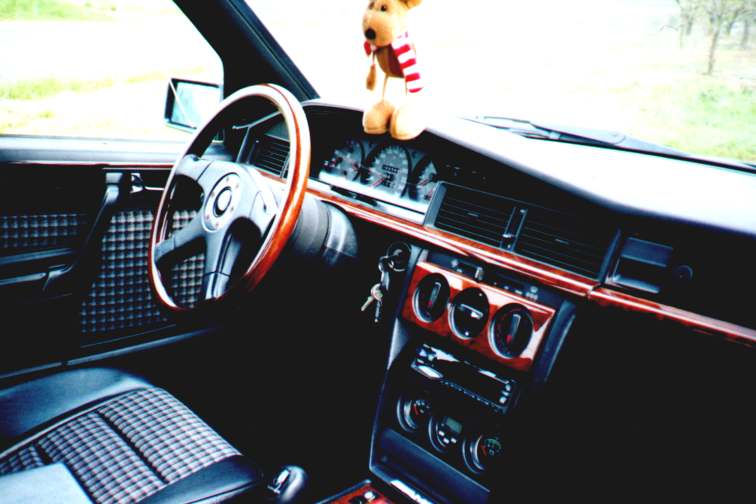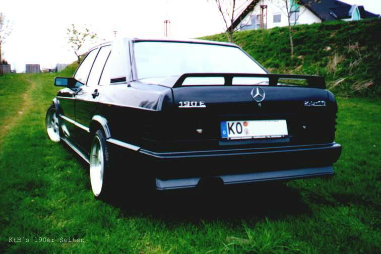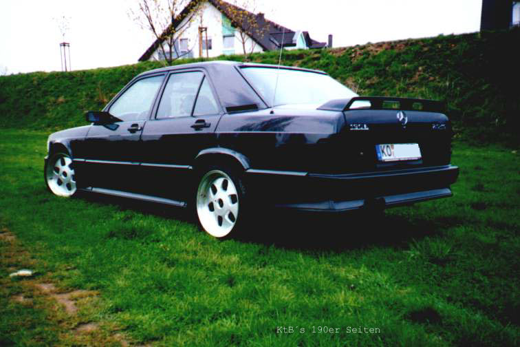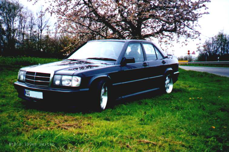 techn Daten (Halterangaben): Geburtsdatum des Halters/Fahrers: 12.12.79 Fahrzeug: 190E 2.3-16, EZ: 24.09.1985, 130kW/177PS, Vmax ca. 225km/h, 185.000km, original blauschwarz-metallic Ausstattung: El.FH vorne, Teilledersitze, Zusatzinstrumente, ZV mit FB, schwarze Rückleuchten (keine Rückstrahler), weisse Blinker, Hupe/Fanfare umschaltbar, Wurzelholz, Momo ML36 Holzlenkrad, Schalthebel gekürzt (Lederversion E-Klasse), MA vorne (Box), MA hinten ausklappbar, rote Zeiger Reifen/Felgen: VA/HA - Falken FK-451 215/40 ZR 17 auf Einteiligen MAE 8,5*17" ET32 (Hersteller: OZ) Fahrwerk: Weitec Federn, VA ca. 50-60mm mit gekürzten Stossdämpfern, HA ca. 35mm (einstellbar durch Niveauregulierung) Auspuff: Serie bis auf modifizierten Endschalldämpfer (super Sound) mit 2 DTM-Anschweissrohren HiFi-Anlage: Cassetten-Tuner Alpine TDA-7572R mit 6er Wechsler Alpine CHA-S 614, 2-Wege JBL System vorne (10cm), 2-Wege MB-Quart System hinten (16cm), JBL-Subwoofer-Röhre im Kofferraum (Verbandskasten offen), AMA 550-System (Mosfet-Endstufe mit 5 Monoblöcken und separatem Netzteil, ca. 55W Sinus-Leistung pro Kanal), aktive Frequenzweiche von AMA