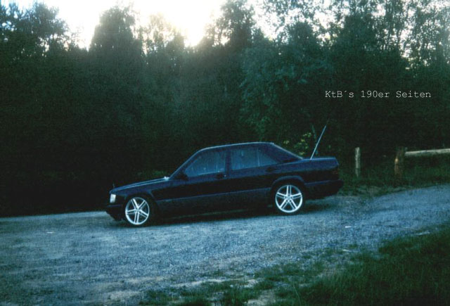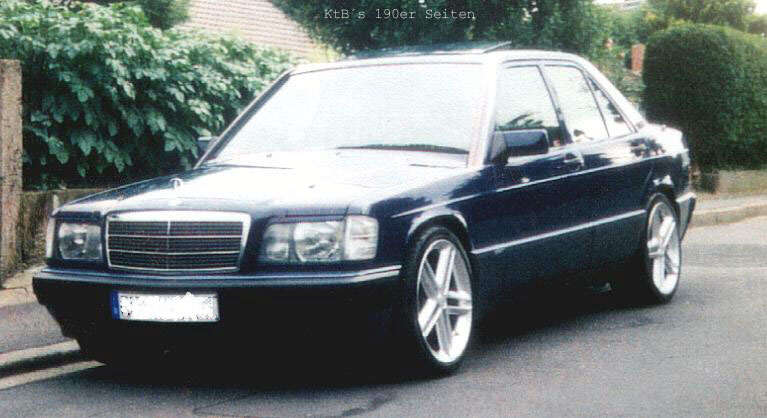 techn. Daten (Halterangaben) 190 E 2.6, Bj 11/91 71.000 km beim Verkauf (Trennungsgrund Benzinverbrauch 21-25 Liter bei "Häkkinenfahrweise) 7 1/2 x 17 mit 215/40 ZR 17 45 mm HR Fahrwerk ZV mit Fernbedienung EFH,ESSHD Farbe: surfblau Grill auf C-Klasse umgebaut Remus Sportauspuff Mittelarmlehne vorn und hinten Lordosenstütze im Fahrersitz Holz ohne Ende