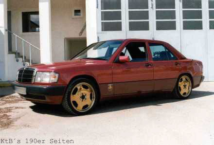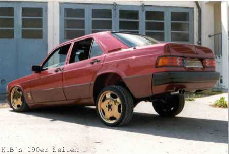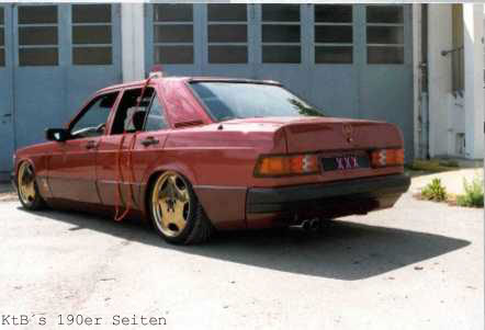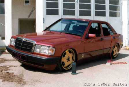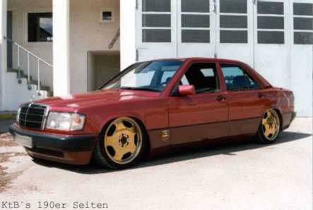 technische Daten (Halterangaben): 190E 2.0 Bj. 6/91 Almadinrot Metallic, Sportline, Autom., Klima Vergoldete 7,5"x17" Intra Felgen , 32 mm Holz Lenkrad mit vergoldeten Speichen, Kühlergrill Gitter ist gerade beim vergolden, "Ami" Blinker, HiFi im Kofferraum: ein ESX Monoblock, 2 AMA Endstufen, 15" Sub in Ersatzradwanne, 3 Wege Rainbows in Doorboards und 13er Altec Lansing in der Hutablage. Die Federn sind komplett ausgebaut und die Federung wird nun von Stickstoff Kugeln übernommen (wie bei Citroen). Stoßdämpfer wurden gegen angefertigte Hydraulik Stempel ersetzt. Der Kofferraum ist jetzt proppen voll. | |||||||||||||||||||||||||||||||||||||||||||||||||||||||||||||||||||||