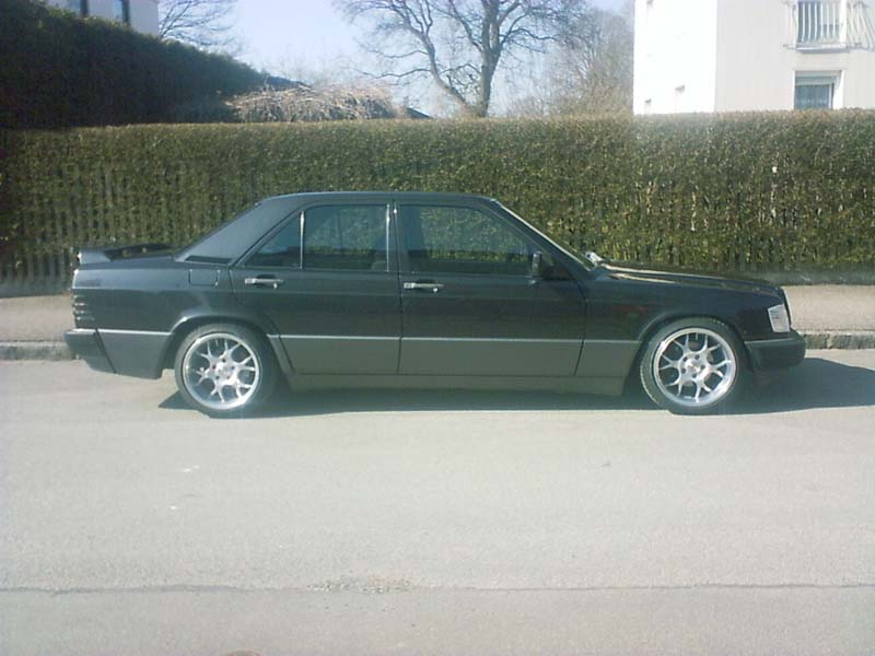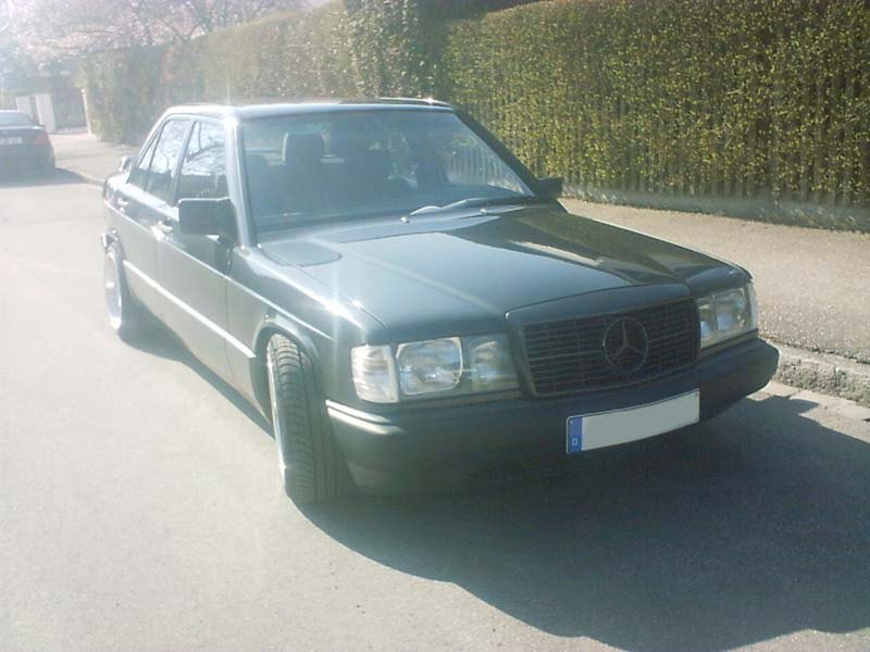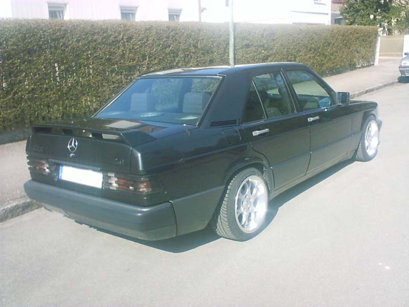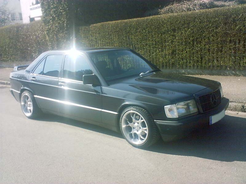 190E 2,6; 160PS; Baujahr 89; Felgen: Borbet BS in 9x16 mit 215/40er Schlappen Federn; Heckspoiler; schwarze Rückleuchten; weiße Blinker; Grill (keine Ahnung woher); und so Kleinigkeiten; Anlage: Headunit: Pioneer DEH-P9300R mit 12fach Wechsler Front+Heck: Infinity Kappa 16 20er Pioneer Pumpe unterm Beifahrersitz 20er Pioneer FreeAir in der Ablage Endstufen: 1x Pyle Millenium 600W (Front+Heck) 1x Pyle Millenium 300W (Bass) D.E.S.I. Alarmanlage