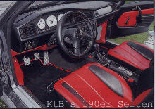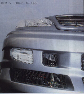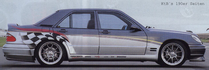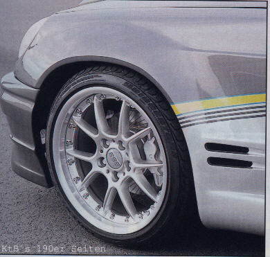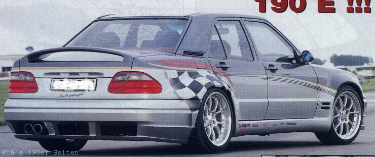 Basis: 190E Bj. 1984 Karosserie: SLK Frontscheinwerfer CLK Heckleuchten Rieger Frontschürze SL Motorhaube Kotflügel vorne 14, hinten 5 cm geweitet Türen unten 3cm geweitet (keine Plastikbeplankung) Kofferraumdeckel mit abgesenktem Mittelteil und integriertem Spoiler (Eigenbau) Fahrwerk: 40mm Jamex Fahrwerk BBS RK II Felgen vorne 8,5 * 18 mit 225/40 hinten 10 * 18 mit 265/35 Motor: original mit Turbolader und Ladeluftkühler von GIK Ergebnis 185 PS sonstiges: geschlitzte Bremsscheiben vom 300E 24V, ... | |
