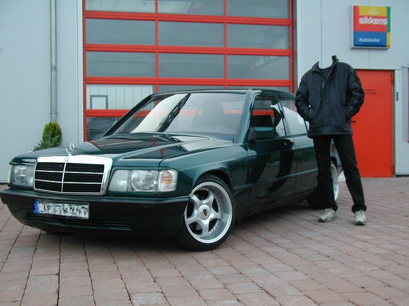 techn. Daten (Halterangaben): - 190 E 2.0 122PS - EZ 1985 - Fahrleistung = 285.000 km bei 240tkm wurde der Motor von Mercedes generalüberholt (läuft wie'n Neuer) - FK 70/40 Fahrwerk - 9*16" ET 26 Shaper Champ mit 215/40 Yokohama A 539 rundum - hinten gebördelt - Weiße Blinker, leicht verdunkelte Rückleuchten - Original Grill modernisiert - *Böser Blick* von Mattig - Ovales Anschweissrohr (nur zur Obtik) - Offener Sportluftfilter von Raid HP (Tröte) - Scheibenwischer auf Mittelstellung umgebaut - wurde neu lackiert (natürlich ne Mercedes Benz Farbe!) war vorher Bundeswehr grün. - FK - Funkfernverbindung für die Zentralverriegelung - Spannungslupe in der Mittelkonsole durch 8 LED'S (Eigenbau) - 32er Raid HP (im Alu look) + Alu Schaltknauf Beleuchtet!! (Blau) - blaue Tachobeleuchtung - drittes Bremslicht mit 50 LED's